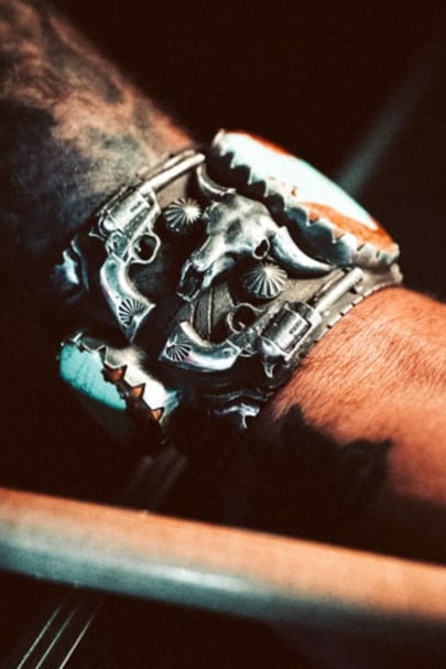 Old stock #8 turquoise in a huge heavy sterling silver setting with cast bison skulls and cast peacemaker revolvers.