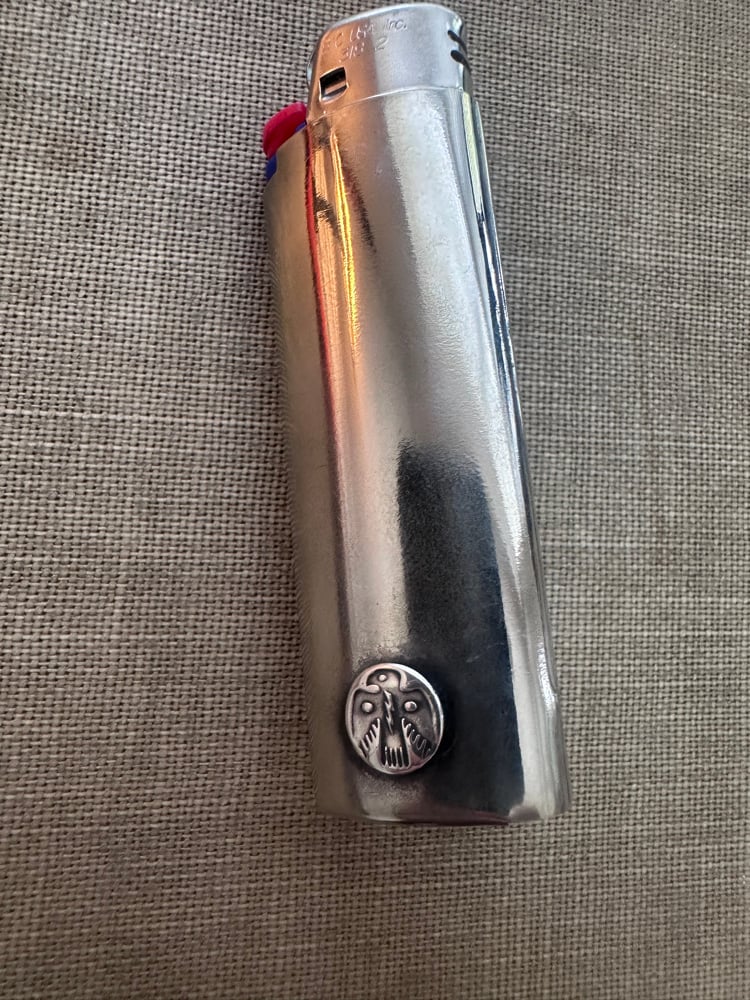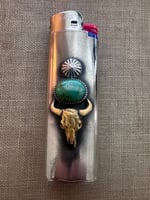 Cast bronze bison skull with sterling silver accents and Royston turquoise on a nickel silver lighter case. Fits standard Bic lighters