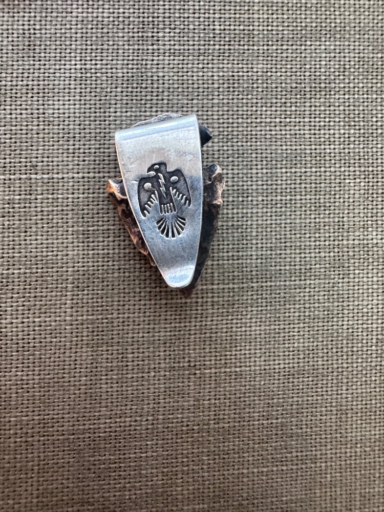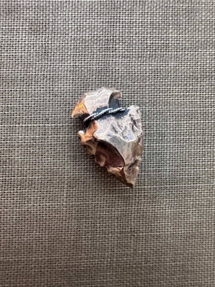 Cast bronze arrow head with sterling silver clip and rope accents. Perfect for all kinds of hats or suit lapels.