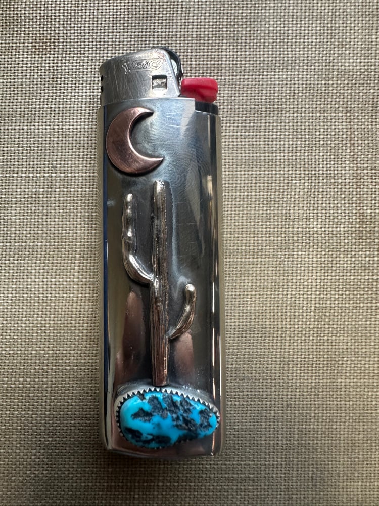 Nickel silver case body with a beautiful bronze cast cactus, copper crescent moon and Sleeping Beauty turquoise nugget. Good for any standard Bic style lighter