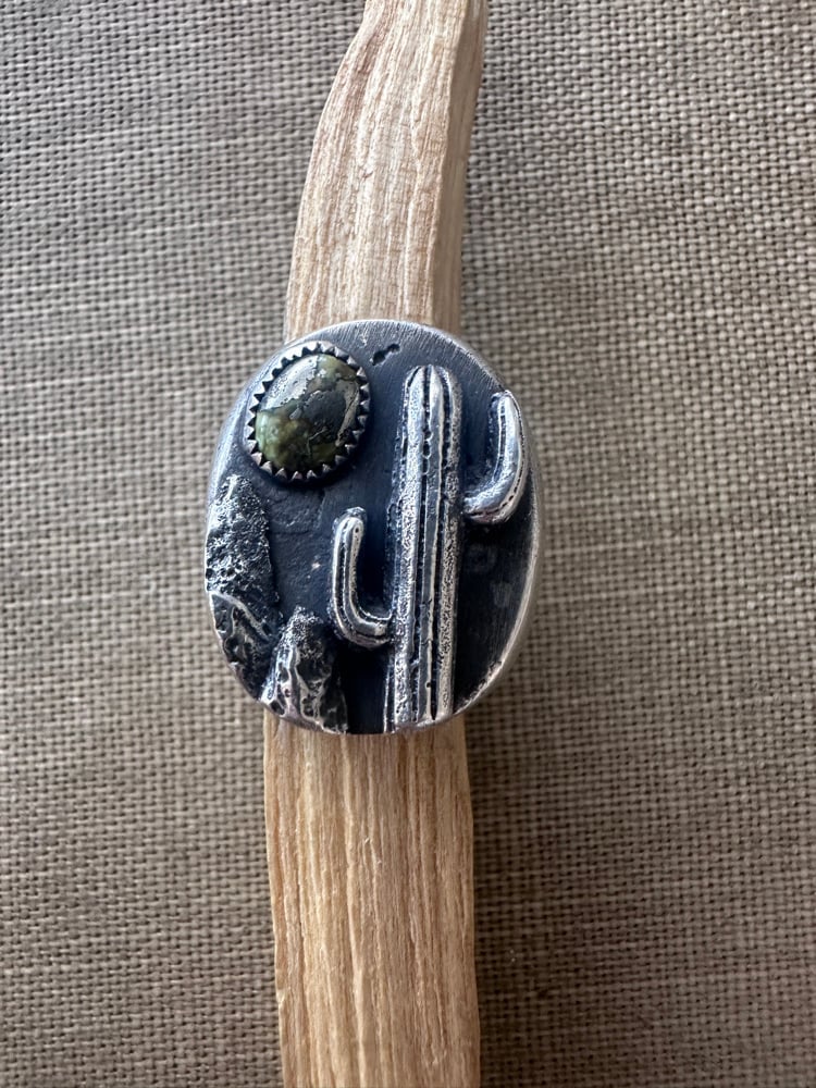 Sonoran Gold turquoise in a solid cast sterling silver setting with cast sterling silver cactus landscape accents