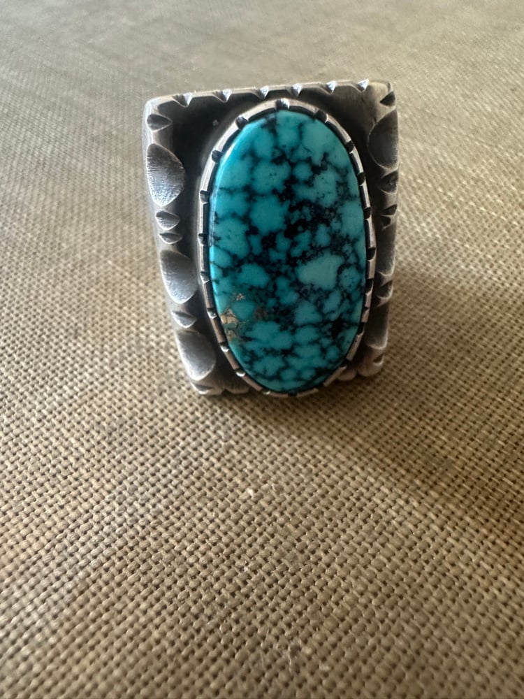 Incredible high grade Kingman Turquoise in a heavy cast sterling silver setting with file cut accents