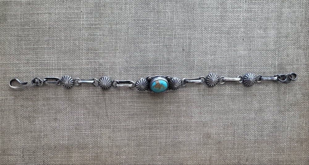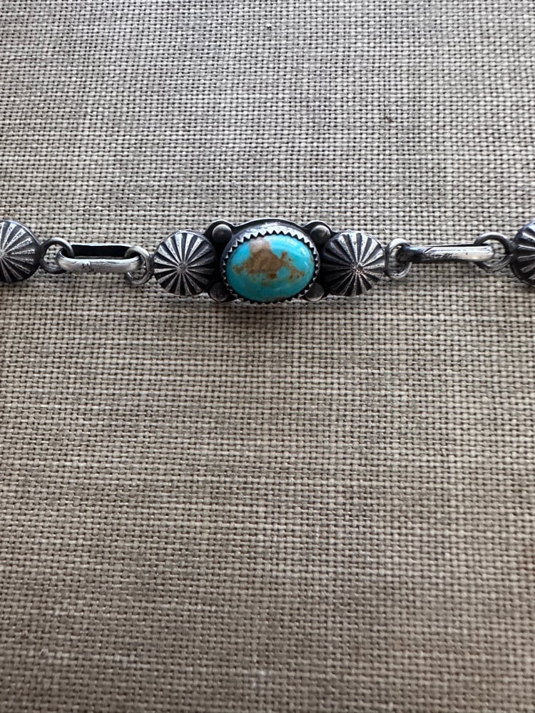 A beautiful piece of Royston turquoise in a sterling silver setting with hand made sterling silver links. Bracelet measures approx 8in with several links for adjustment