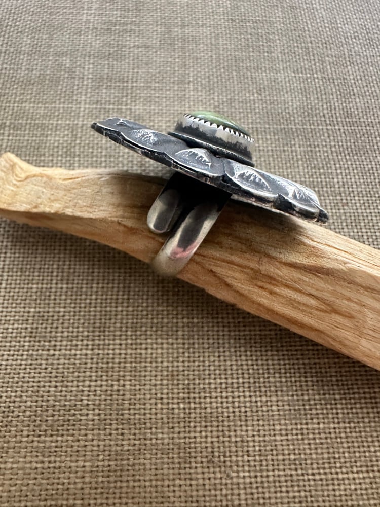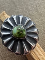 Sterling silver concho with gorgeous green Sonoran Gold turquoise. Adjustable ring shank.